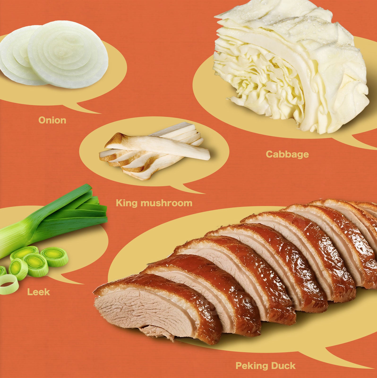 Cabbage, Duck, Spanish Yellow Onion, King Mushroom, Water, Leek, Peking Duck Sauce (Hoisin Sauce (SFC01),Ground Bean Sauce (C): soybean oil,Ground Bean Sauce(fermented soybean past(water,soybeans,rice,salt,wheat flour),water,sugar,contains less than 2% of corn starch,soybean oil,salted sake(sake[water, irce,koji(aspergillus oryzae)]salt),sesame oil),Hoisin Sauce(Sugar,water,sweet potato,salt, modified corn starch,soybeans,spices sesame seeds,wheat flour,garlic,chili pepper,and acetic acid),Red Fermented Bean Curd(water,bean curd,cooking wine,salt,sugar),sugar, garlic,ginger), Green Onion Oil (soybean oil,Green Onion), Seasoning Soy Sauce (water,soybeans,salt,wheat flour), Potato Starch, Salt, Sugar, Spice (White Pepper,Ginger Powder,Anelica Dahurica Powder), Multi-Flavored Seasoning(十三香) (Anise star,fennel,sichuan pepper,galangal ginger,tangerine peel,black pepper,nutmeg, ginger,licorice,amomum,clove,angelica dahurica), Spice(五香粉) (Ginger,Cinnamon,Cumin Seeds,Aniseeds,Citrus Peel,Sulpur Dioxide(Sulfites)), Garlic.