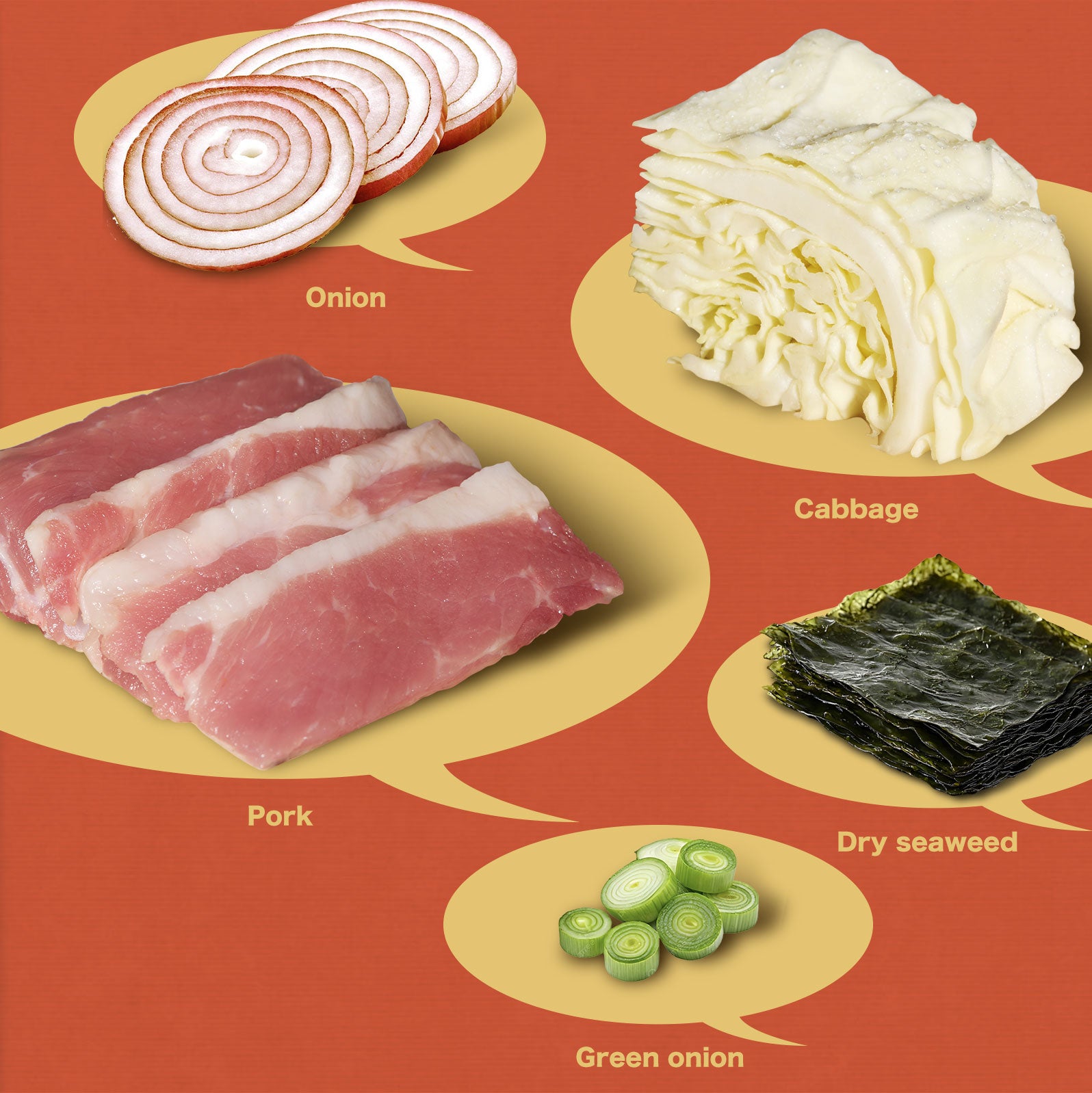 Leg Pork, Cabbage, Pork Stock (Water,Pork Bone,Ginger,Green Onion,Dry Seaweed,Salt,Anelica Dahurica Powder), Green Onion, Green Onion Oil (soybean oil,Green Onion), Egg White, Seasoning Soy Sauce (water,soybeans,salt,wheat flour), Potato Starch, Salt, Sugar, Garlic, Spice (White Pepper,Ginger Powder,Anelica Dahurica Powder), Sesame Oil.