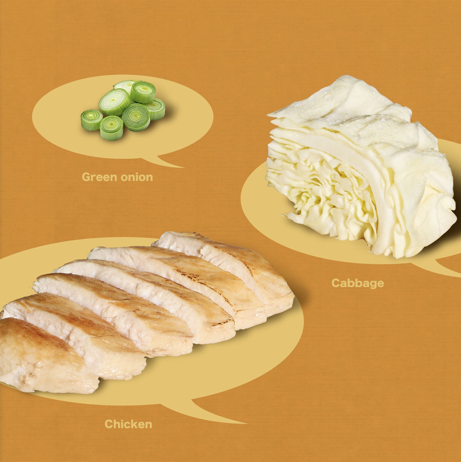 Chicken (leg meat and skin), Cabbage, Chicken Stock (water,chicken skin ,chicken bone,Green Onion,soybean oil,dry seaweed,salt), Green Onion, Green Onion Oil (soybean oil,Green Onion), Egg White